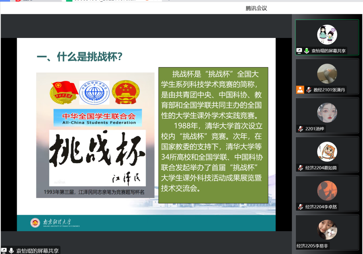 11月7日晚,我院于腾讯会议线上举办了以“但积跬步,行以致远”为主题的2022年金沙集团1862cc成色“挑战杯”全国大学生课外学术科技作品竞赛(简称“大挑”)动员及经验分享会。学院党委副书记袁怡琨老师,统计系副主任、副教授李庆海老师出席会议,数经2001班纪齐和桑海瑞同学作行经验分享,学院各年级同学参加此次动员会。