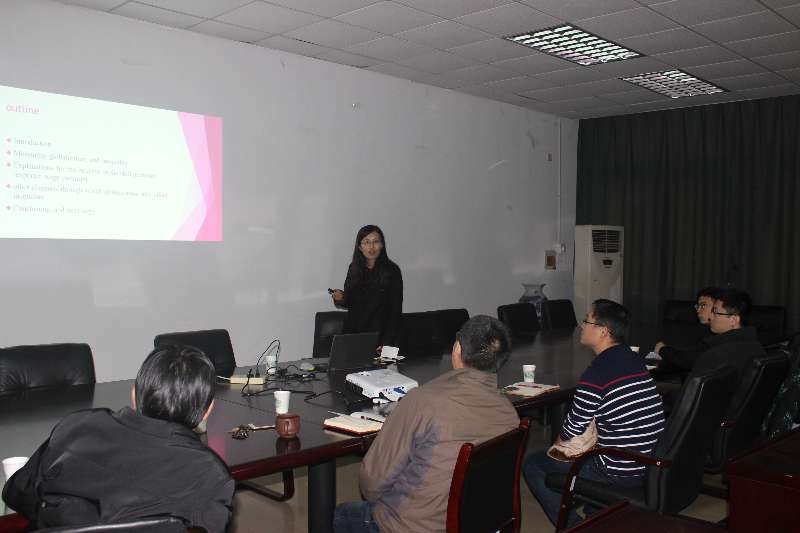 1月17日下午2:30,我院“收入分配与经济增长”学术论坛第20次报告会在金沙集团1862cc成色307会议室召开。本次讨论会由我院副院长叶林祥教授主持,国际经贸学院青年教师史青博士做了“全球化与不平等”的学术报告。