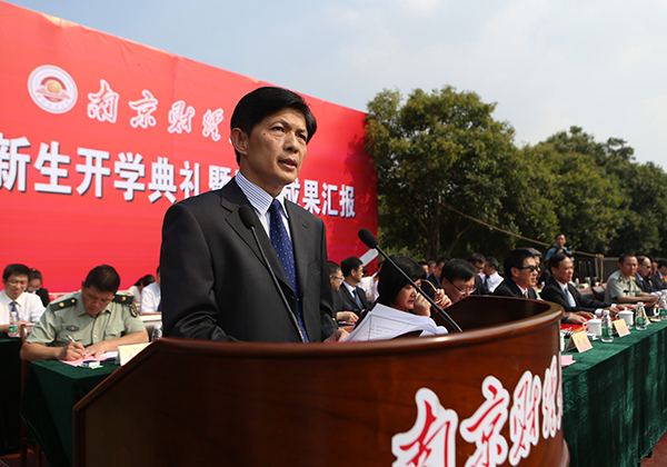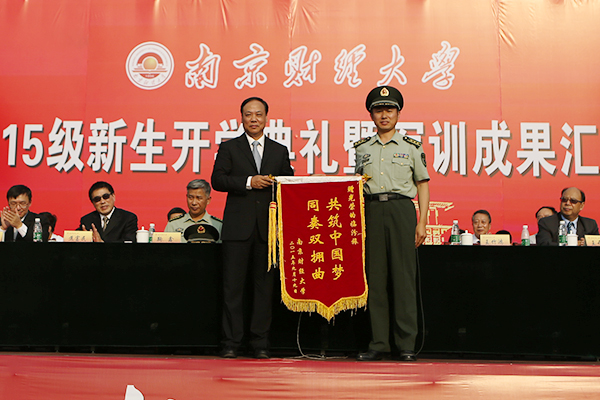 9月19日下午,我校2015级新生开学典礼暨军训成果汇报大会在仙林校区西苑运动场隆重举行。全体校领导及江苏省军区副参谋长鞠鑫、承担此次军训任务的解放军临汾旅教官出席大会,有关职能部门和学院主要负责人,我校3700余名2015级本科新生参加了开学典礼暨军训成果汇报大会。