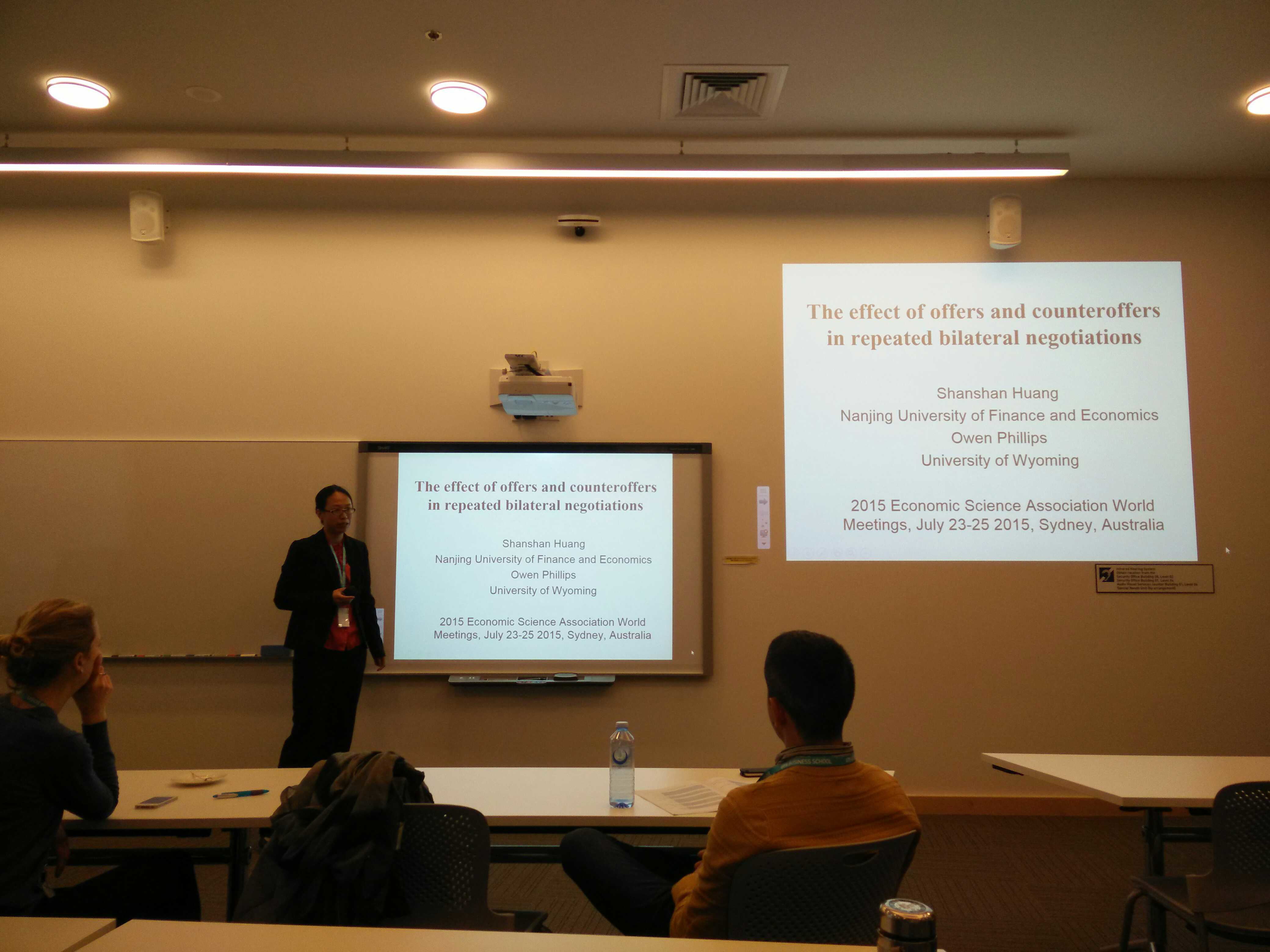 7月20日,金沙集团1862cc成色黄姗姗博士远赴澳大利亚悉尼参加2015届经济科学协会世界大会(Economic Science Association),并作题为“讨价还价在重复性双边商业谈判中的影响”的学术报告。