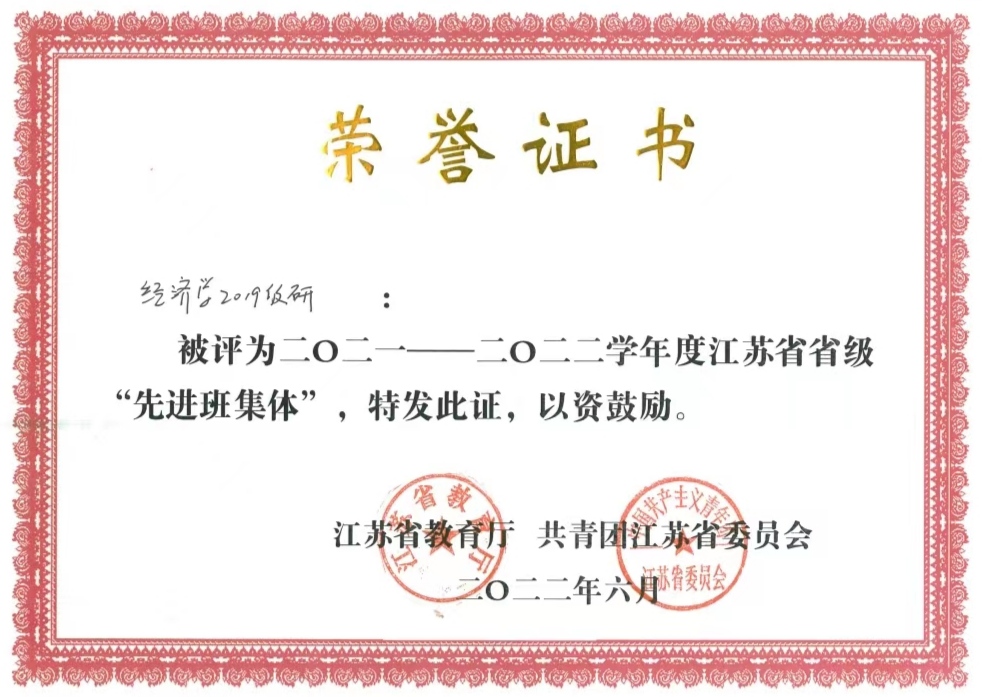 近日,江苏省教育厅、团省委下发通知,在各高校层层推荐、择优遴选的基础上,经审核、公示,我院经济学2019级研被评为江苏省普通高校省级“先进班集体”,2020级应用统计专业黄欣媛被评为江苏省普通高校省级“优秀学生干部”,2019级人口、资源与环境经济学专业王庆玲被评为江苏省普通高校省级“优秀毕业生”。